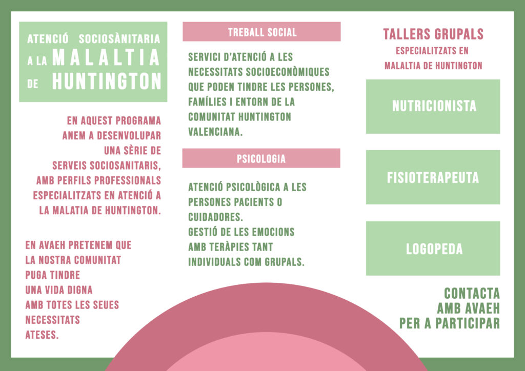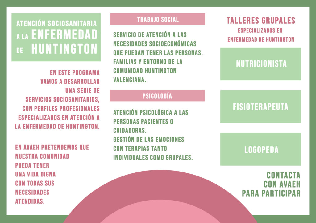 Para poder atender las necesidades sociosanitarias de todas las personas que conviven con la ENFERMEDAD DE HUNTINGTON y viven en la Comunitat Valenciana. Los servicios que vamos a ofrecer son Trabajo Social, Psicología, Fisioterapia, Logopedia y Nutrición. Con personas profesionales y atención adaptada y especializada en Enfermedad de Huntington.