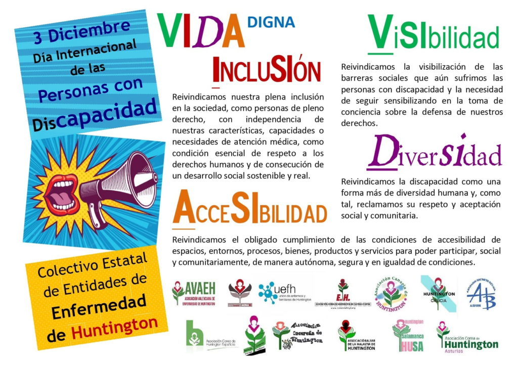 Por ello hoy, desde el Colectivo Estatal de Entidades de Enfermedad de Huntington, visibilizamos a nuestras personas afectadas desde la perspectiva de la discapacidad, reivindicando una vida digna en una sociedad con y para tod@s.